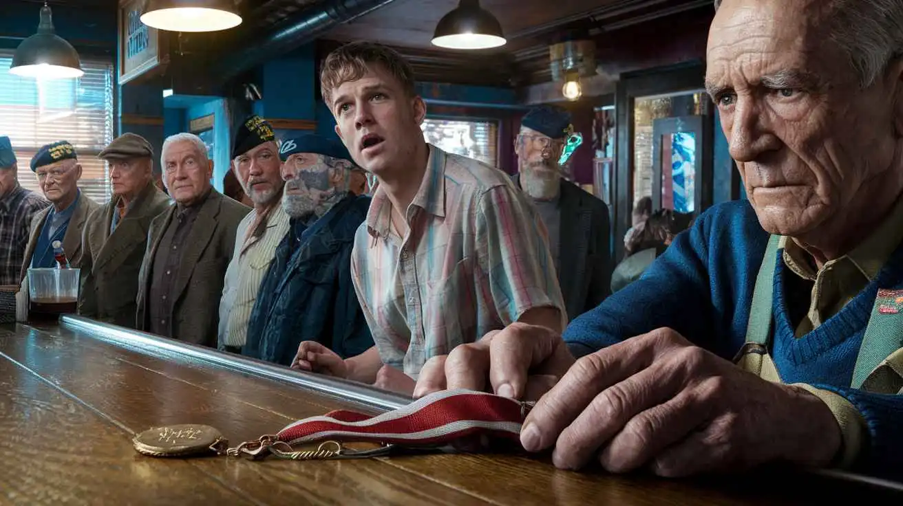 A man at the far end of the bar stood up so fast his stool scraped loudly across the floor. He stared at the medal, his jaw tightening.